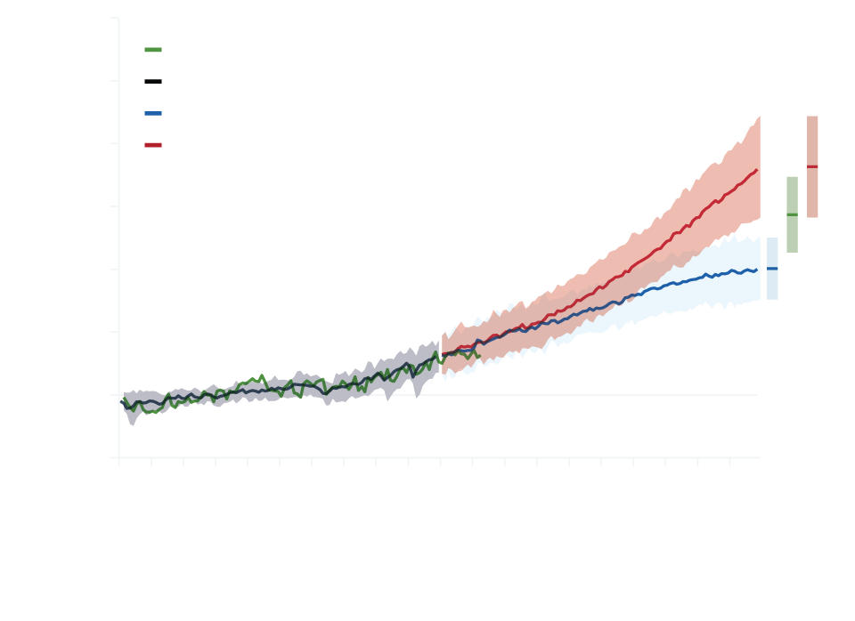 Scientists consider it very likely (90-100% probability) that increasing atmospheric concentrations of greenhouse gases will increase global average temperatures, and will also change precipitation patterns in many regions of the world. There is some difference among models, however, due to the way that physical climate processes are mathematically represented in different models. As a result, there is range of projected changes across different models, as shown in the figure below, which summarizes the range in projected changes in temperature under the low emissions scenario (RCP 2.6) and the high emissions scenario (RCP 8.5). The dark red and dark blue lines represent the average projection calculated from all models, and the shading represents the range of projections across models. As our ability to measure and model a range of physical climate processes continues to improve, the range in the projections across models (the shaded area) is expected to shrink.